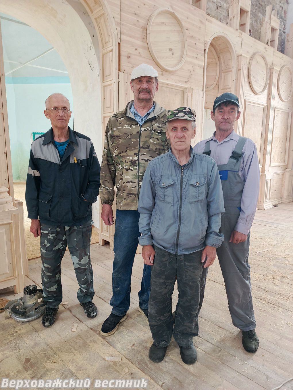 Волонтеры Николай Нарывкин, Геннадий Кушев, Владимир Галкин, Александр Байдаков работают над возведением 15-метровой конструкции иконостаса